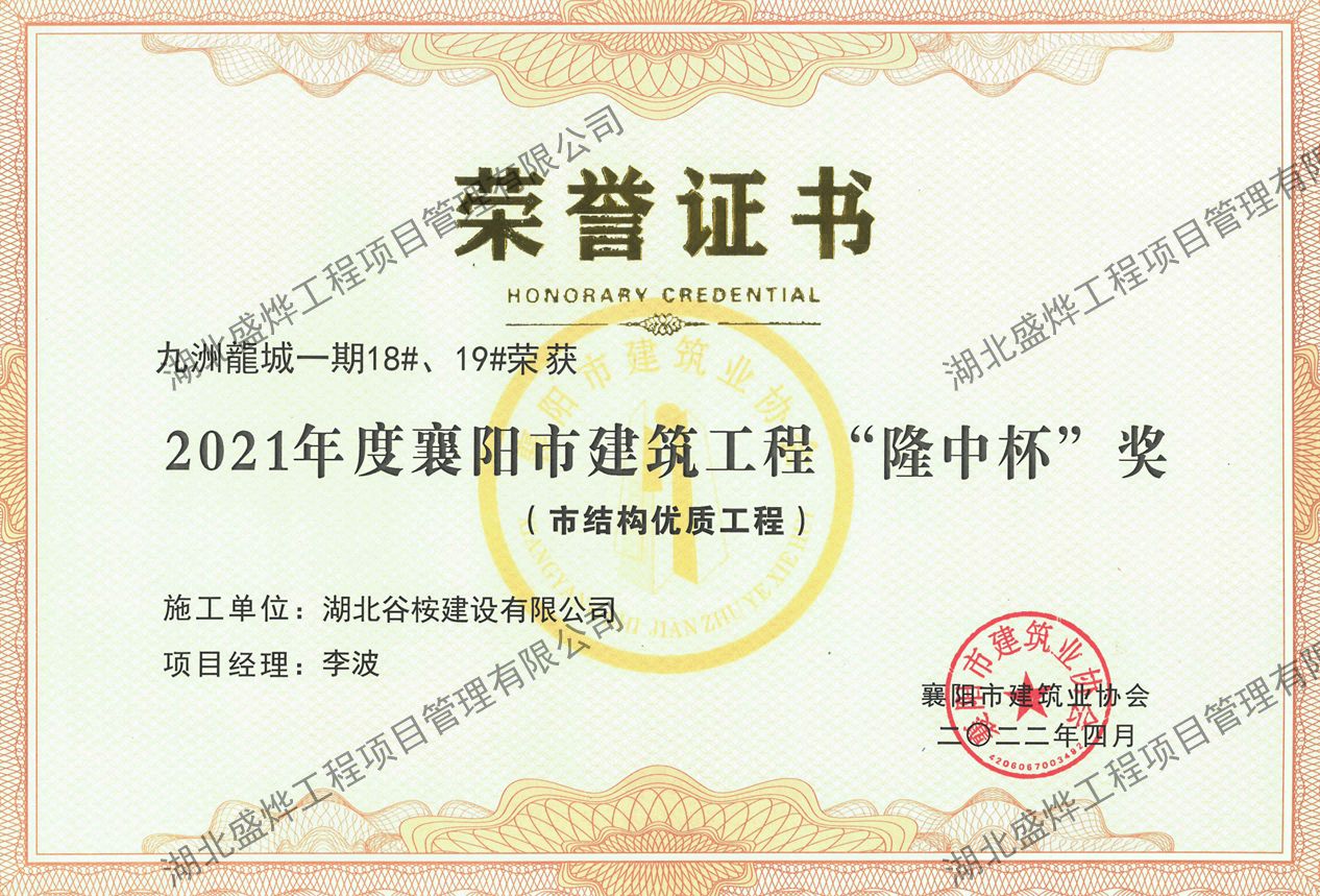 九州龍城18#、19#楼办公楼“隆中杯”奖(市结构优质工程)